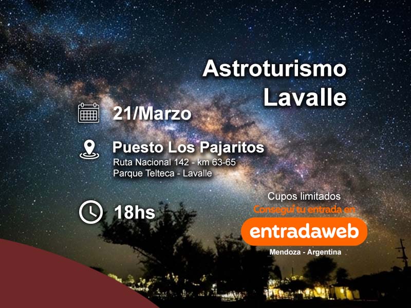 ¡Únete a nosotros para una experiencia única de astroturismo en el Puesto Los Pajaritos, ubicado en el Parque Teleteca, Lavalle! El sábado 21 de marzo a las 18hs, disfruta de una noche mágica bajo el cielo estrellado, lejos de la contaminación lumínica, en un entorno natural que te permitirá observar cuerpos celestes con una claridad impresionante.